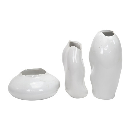 The Air Vases bring sophisticated visual drama to any interior space with their artfully dimpled ceramic silhouettes and luxurious bronze-lined interiors. These contemporary vases showcase a stunning interplay of matte gray exteriors and metallic inner surfaces, creating captivating light reflections throughout the day. Available as a set of three distinct sizes - a small vessel measuring 9.5"L x 7"W x 6"H, a medium piece at 7.5"D x 9"H, and a statement large vase at 8"D x 13.5"H - these modern decor pieces offer versatile styling options. Each vase features an organically crumpled design that mimics the fluid movement of fabric or paper, bringing an artistic element to mantels, console tables, or dining room centerpieces. The cool gray ceramic finish complements both modern and transitional home decor styles, while the bronze interior adds a touch of warmth and understated glamour. Perfect for displaying dried botanicals or standing alone as sculptural accent pieces, these distinctive vases blend functionality with high-end design sensibility.