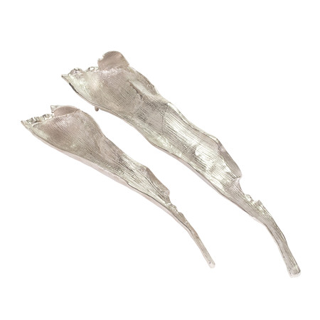 Honor Silver Metal Decorative Feather Trays, Set of 2 The Honor Feather Trays blend organic form with sculptural sophistication, offering a striking interpretation of natural texture in a silver metallic finish. Crafted from cast metal, this set of t…