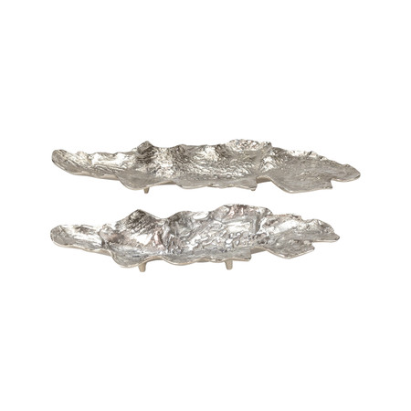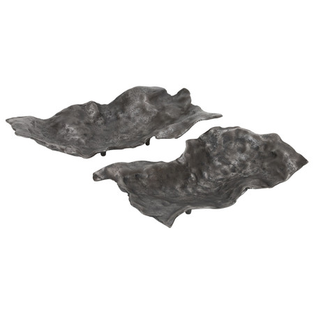 Timeless and sculptural, the Diem Trays reinterpret the classic pedestal form with a bold, modern edge. Crafted from black-finished metal, this set of two trays features elongated oval surfaces supported by flared pedestal bases, creating dramatic elevation and vintage-inspired character. The dark, matte surface highlights the smooth curves and subtle rim of each tray, lending depth and presence to their clean silhouette. Offered in two sizes—26 inches long by 7 inches high and 22 inches long by 5.5 inches high—these trays are designed to work together or individually, bringing variation in height and form to any decorative arrangement. Their raised construction makes them visually striking while adding practical versatility to tabletops, sideboards, or display areas. The Diem Trays blend old-world charm with modern minimalism, creating a refined focal point that elevates any styled setting.