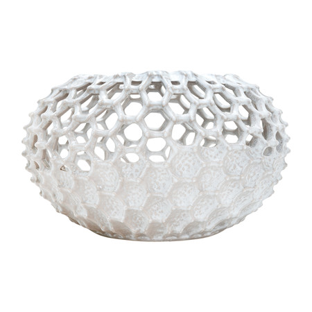The Kaz Vase combines sophisticated contemporary design with artisanal craftsmanship through its distinctive honeycomb cutout pattern and subtle two-tone finish. This premium stoneware piece features a predominant white surface with warm beige undertones that add depth and visual interest, measuring a versatile 9.5L x 9.5W x 11H inches. The intricate lattice openwork creates dynamic light play throughout interior spaces while the textured base showcases the natural character of the handcrafted ceramic. Perfect for mantels, console tables, and dining centerpieces, this decorative vessel commands attention in both minimalist and eclectic settings. The organic oval silhouette and delicate color variation make the Kaz Vase an exceptional statement piece that blends contemporary elegance with artisanal quality, enhancing residential and commercial spaces with refined sophistication and timeless appeal.
