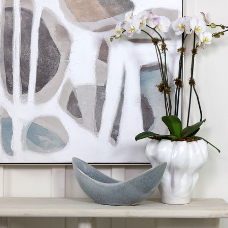 The Skye Bowl is a striking decorative vessel designed to bring both elegance and contemporary flair to your home decor. Crafted from durable stoneware, this generously sized bowl measures 19 inches in length, 6 inches in width, and 8.5 inches in height, offering an impressive silhouette that naturally commands attention. The elongated, boat-shaped form gives the piece a sculptural quality, while its soft light gray finish is enhanced by a subtle speckled texture that creates visual depth and refined character. Its neutral tones make it exceptionally versatile, seamlessly blending into both modern and transitional settings. Perfect for styling on a dining table, console, or sideboard, the Skye Bowl provides a sophisticated base for displaying dried botanicals, decorative stones, or seasonal accents. It can also stand alone as a statement centerpiece, exuding understated charm while elevating the ambiance of any space. Whether used in residential interiors or curated retail displays, this decorative bowl embodies the refined quality and timeless appeal that Kavana Decor is known for, making it an essential addition to any collection.
